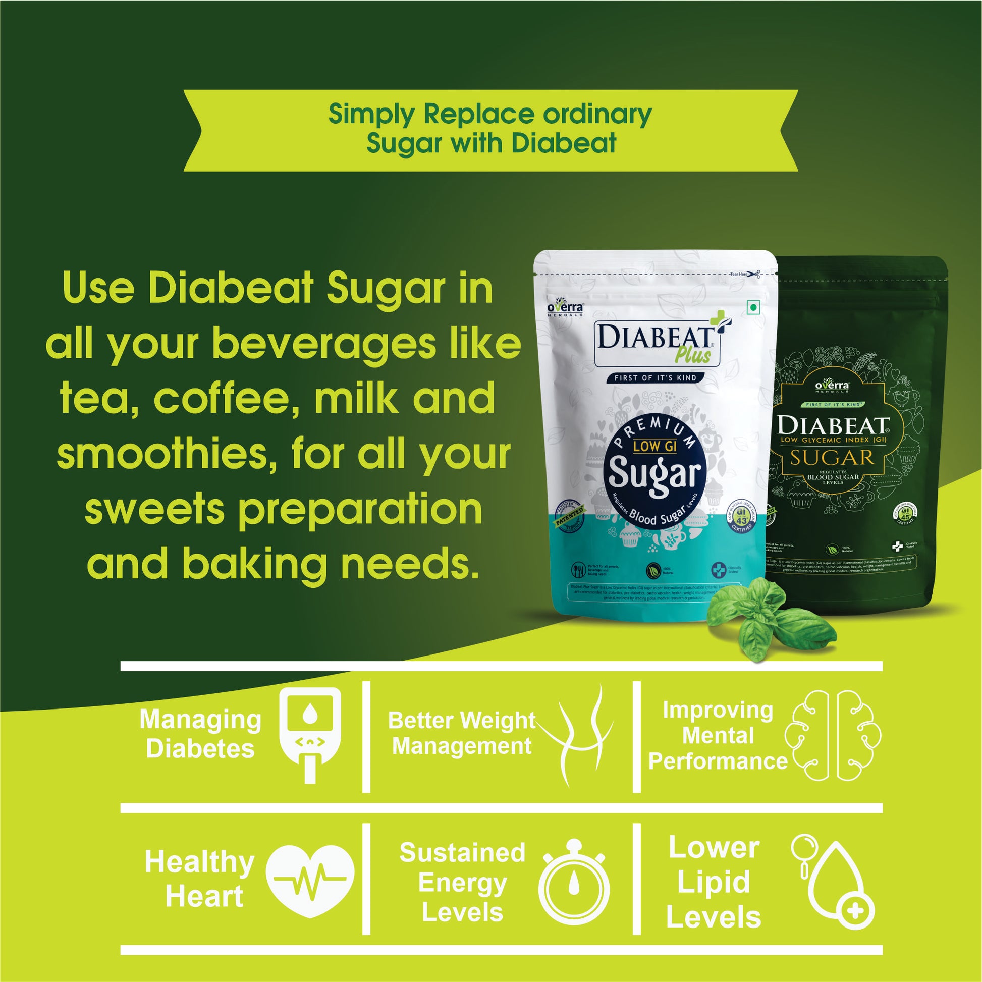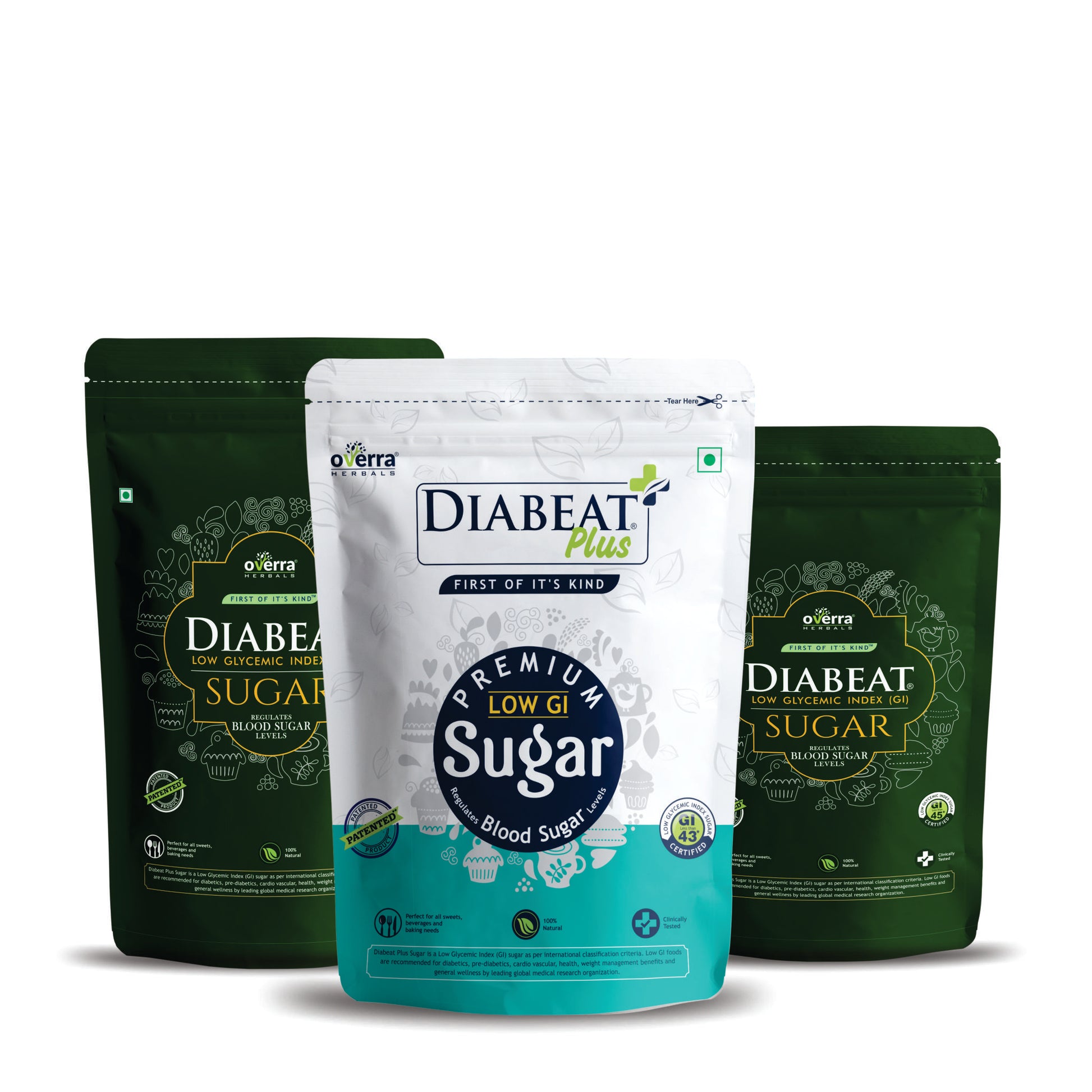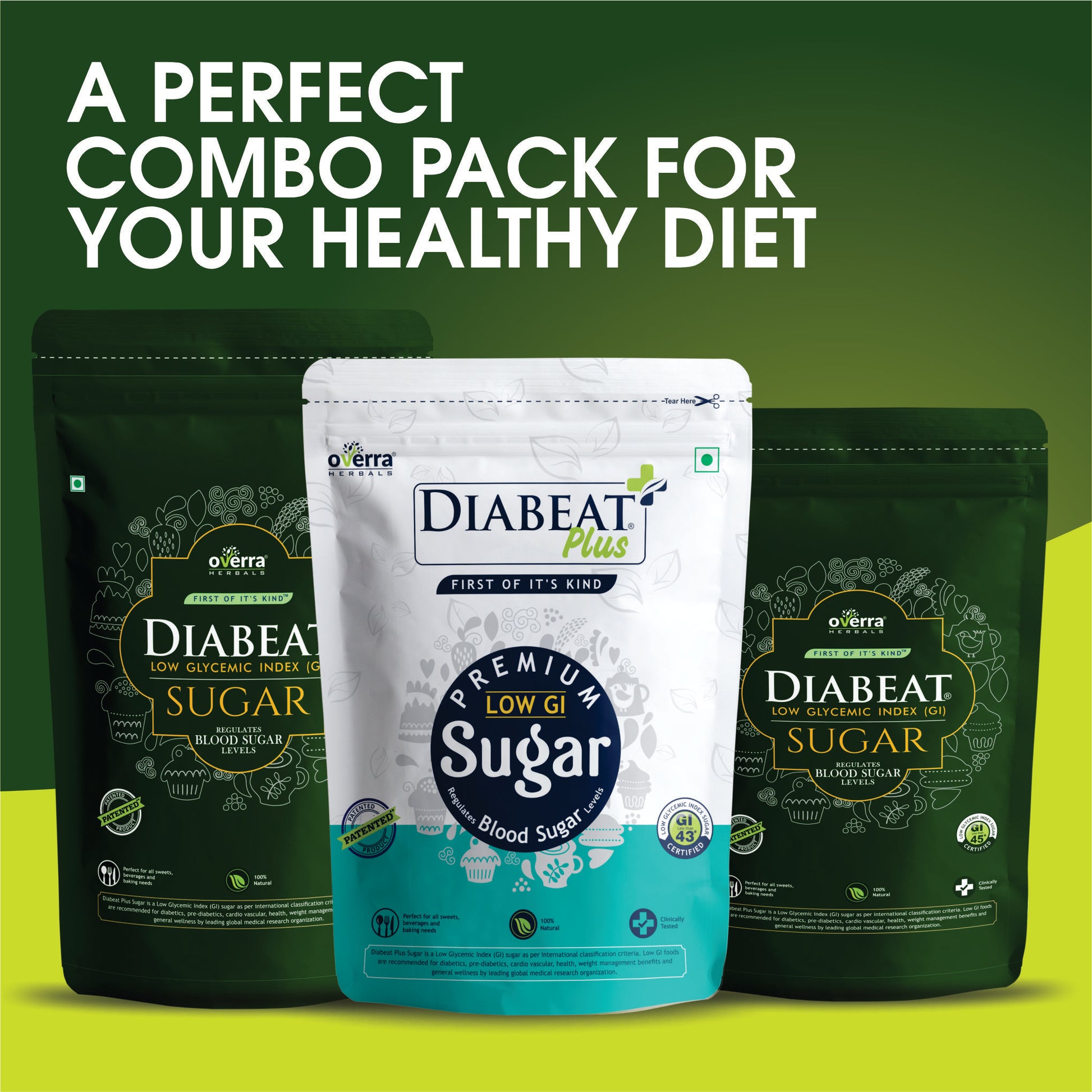 A low GI healthy combo pack includes products that have a low impact on blood sugar levels, making them a great option for individuals looking for a healthier lifestyle. This pack typically consists of low GI sugar like Diabeat Plus 500 g, Diabeat Green 500 g and Diabeat Green 1000 g,